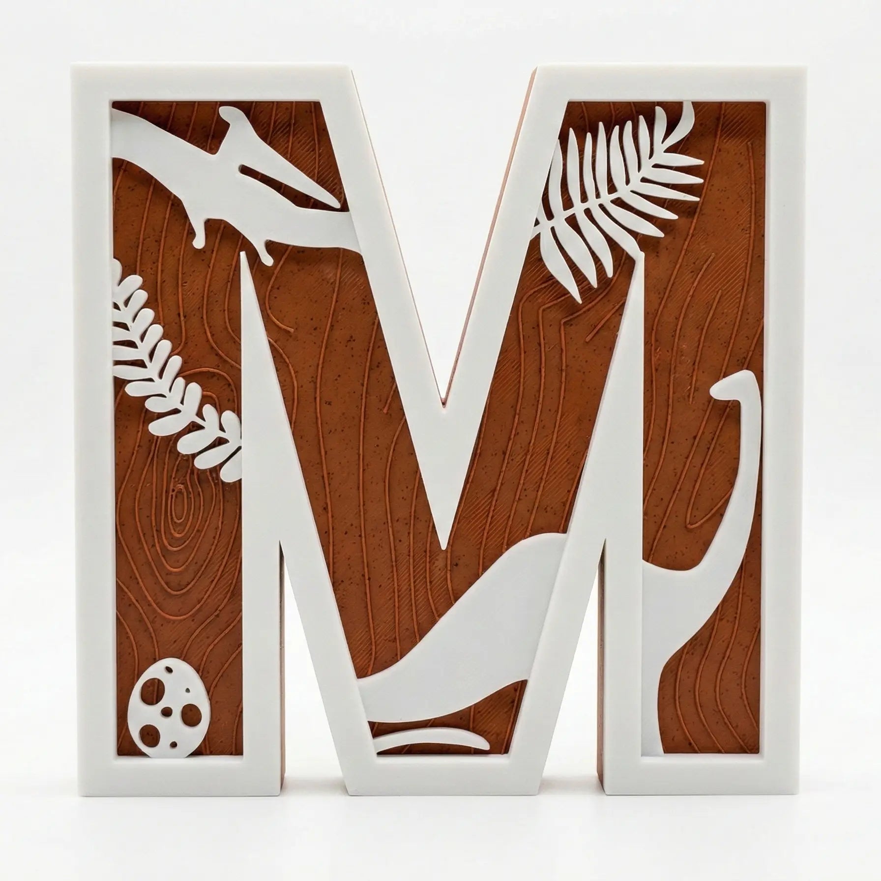 Cuerpo y Estructura: Construcción compuesta de doble capa. Marco exterior y siluetas (pterodáctilo, saurópodo, helechos, huevo y más) en acabado blanco mate liso. Fondo en tono terracota/tierra con micro-textura que simula vetas de madera o estratos geológicos. Selecciona color y letra.
